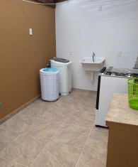 Geminado n° 01, semi mobiliado, com 2 suítes na parte superior, no andar debaixo, sala e cozinha integradas e nos fundos uma pequena área de serviço. Vaga de garagem não coberta para 01 carro;